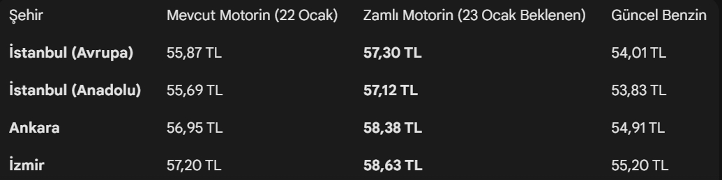 Ocak ayında peş peşe gelen zamlar, araç sahiplerini anahtar bırakma noktasına getirdi. Sektör kaynaklarından alınan bilgiye göre, motorinin litre fiyatına 23 Ocak Cuma gününden itibaren geçerli olmak üzere 1,43 TL zam yapılması öngörülüyor. Bu zamla birlikte motorin fiyatları Ankara ve İzmir gibi büyükşehirlerde 58 TL’yi aşarak 60 TL eşiğine bir adım daha yaklaşacak. İşte İstanbul, Ankara ve İzmir’de 22 Ocak güncel ve Cuma günü beklenen zamlı tablo.