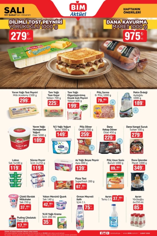 BİM, yeni haftaya temel gıda ürünlerini kapsayan Salı aktüel kampanyasıyla giriyor. 3 Şubat’tan itibaren raflarda yerini alacak ürünler arasında tost peyniri, yoğurt, sucuk, döner ve kavurma gibi sık tüketilen gıda ürünleri bulunuyor. Kampanya, özellikle et ve süt ürünlerindeki fiyatları yakından takip eden tüketiciler için dikkat çekici seçenekler sunuyor.