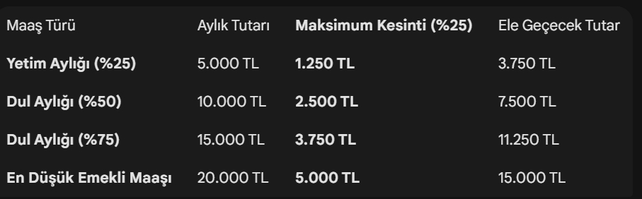Yeni sistem sadece emeklileri değil, vefat eden sigortalıdan dolayı “ölüm aylığı” alan eş ve çocukları da kapsıyor. Özellikle düşük hisse oranlarıyla bağlanan bu aylıklarda yapılacak kesintiler, sosyal yardım tadındaki maaşların daha da erimesine neden olacak.