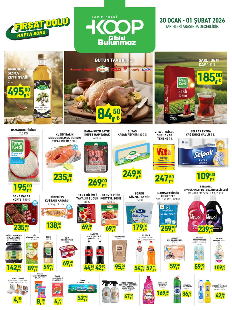 Tarım Kredi Market, Ocak ayını büyük bir kampanya dalgasıyla kapatıyor. 30 Ocak Cuma sabahı başlayan ve Pazar akşamına kadar sürecek olan indirimlerde; 2 litrelik sızma zeytinyağından bütün tavuğa, dev paket pirinçten kaşar peynirine kadar onlarca temel gıda ürünü piyasa ortalamasının çok altına çekildi. Hijyen grubundaki Perwoll ve Selpak fırsatları ise temizlik bütçesini rahatlatacak.