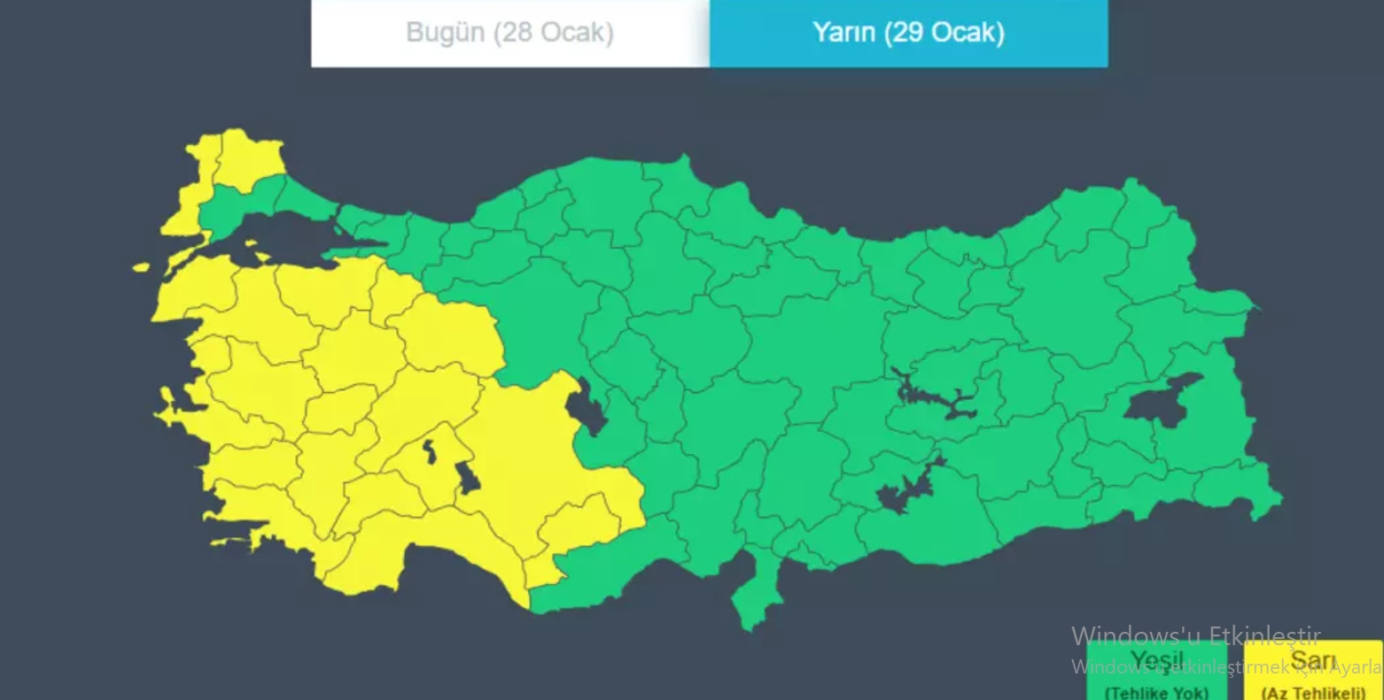 Meteoroloji Genel Müdürlüğü, yarın sabahtan itibaren Türkiye’nin batı kesimlerini esir alacak yağışlı ve fırtınalı sistem için “sarı kodlu” alarm verdi. Trakya kapısından girecek olan sistemin, özellikle Ege ve Batı Akdeniz’de çok kuvvetli sağanak yağışa ve saatte 80 kilometreyi aşan fırtınaya neden olması bekleniyor.